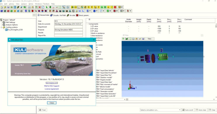 在發動機、變速箱、換熱器、風扇、沿用件、電池以及控制元件和執行器等方面都進行專注的研究和分析,從而達到一個理想的平衡,而MAGNA KULI的功能就是進行標準的模擬,從而找出最佳方案,剔除有問題的方案,這樣做既減少了時間、金錢、人力成本,也提高了效率,保障了最終的品質,讓你的產品始終佔據市場有利地位,軟體提供完善的設置系統元件和控制策略,靈活的模組結構方便使用者進行精准的功能選擇,對各種假設的環境和情況進行詳細分析,並能夠將分析結果匯出保存。